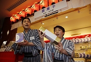 エスカレーターとエレベーターが完備された新しい歌舞伎座ロビーでの初の模擬店は、満員のお客さまにお怪我などないよう、細心の配慮をして準備いたしました。